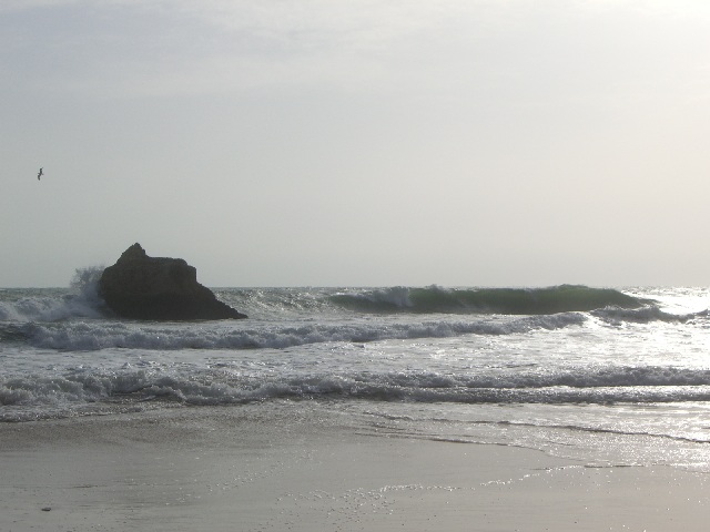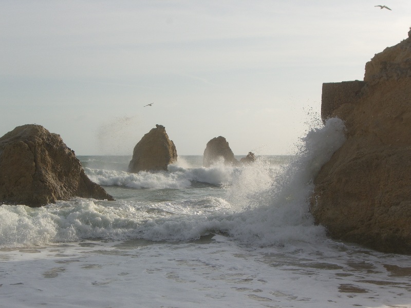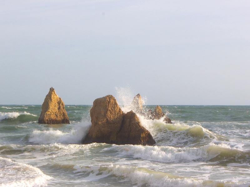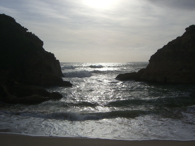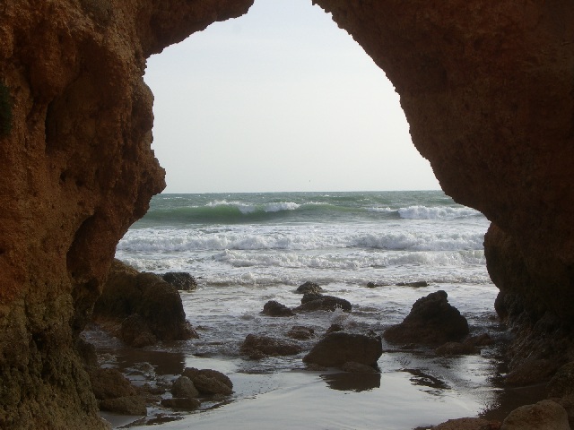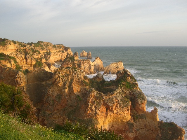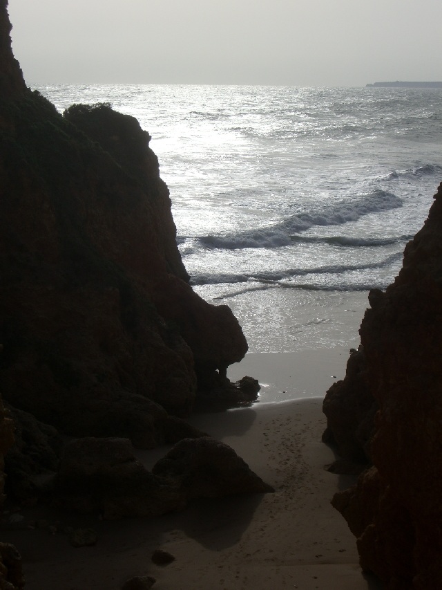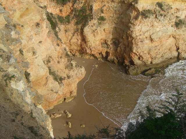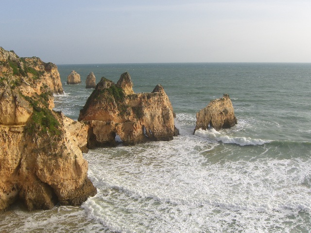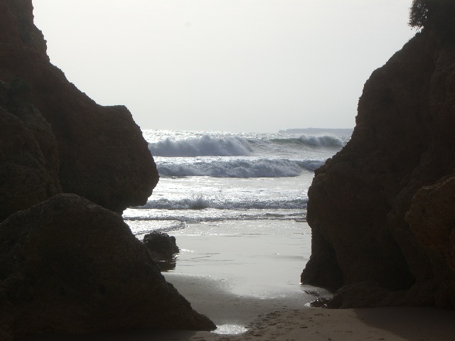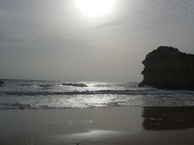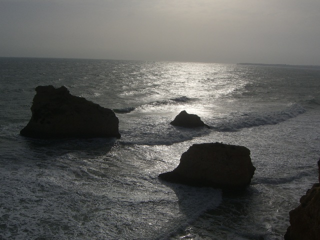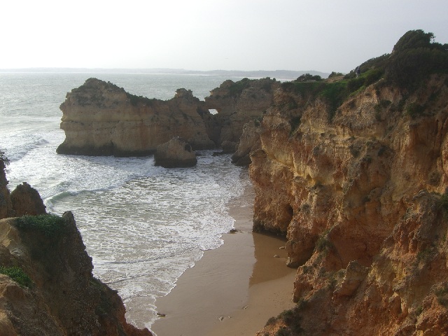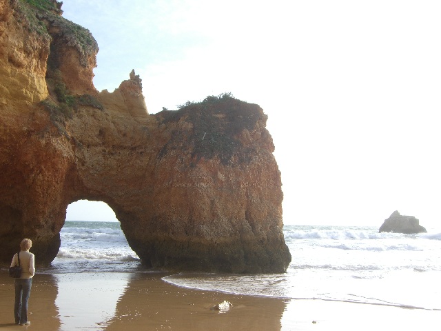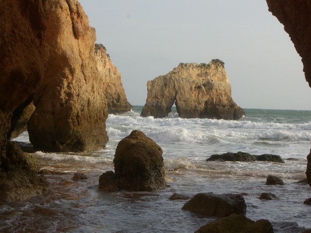Alvor ist ungefähr in der Mitte zwischen Lagos und Portimao, wo der bekannte Praia da Rocha Strand liegt. Diese Foto ist in der Nähe von Prainha (kleiner Strand) und heisst Praia dos Tres Irmãos (Strand der drei Brüder), wahrscheinlich wegen den drei Steinen, die man hier auf diesem sehr windigen Tag sehen kann. |